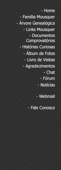 Família Mousquer. Este site foi construído com muito carinho para aproximar nossos familiares. Se precisar de alguma ajuda, por favor, utilize nosso Fórum. Ele foi criado para ser um ponto de encontro, tanto para nossos familiares, quanto para os amigos. Caso encontre qualquer erro, ou mesmo surja uma dúvida, por favor, avise ao Webamaster através do e-mail: paulorenato@mousquer.com.br. Utilize o menu à sua esquerda para conhecer nosso site. Boa navegação! |